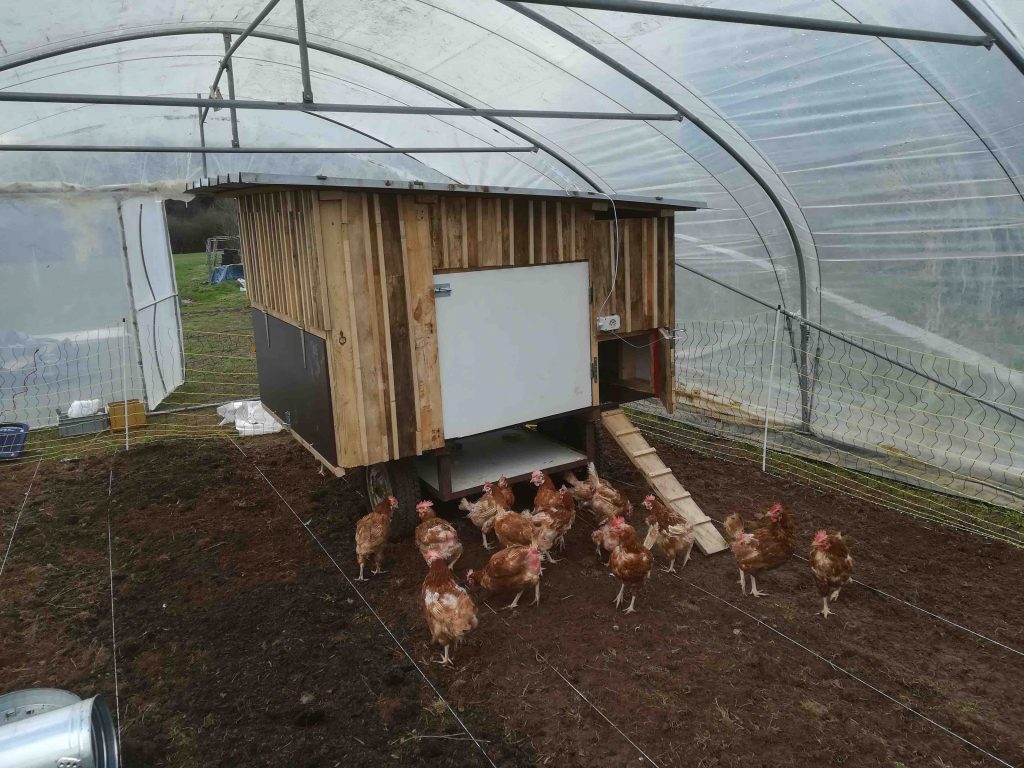 Matériaux de récupération, mobilité des poules pour une aide précieuse au nettoyage et à la fertilisation des parcelles, et sauvetage de l’abattoir de poules réformées d’un élevage bio de la région… avec de bons gros oeufs en contrepartie !